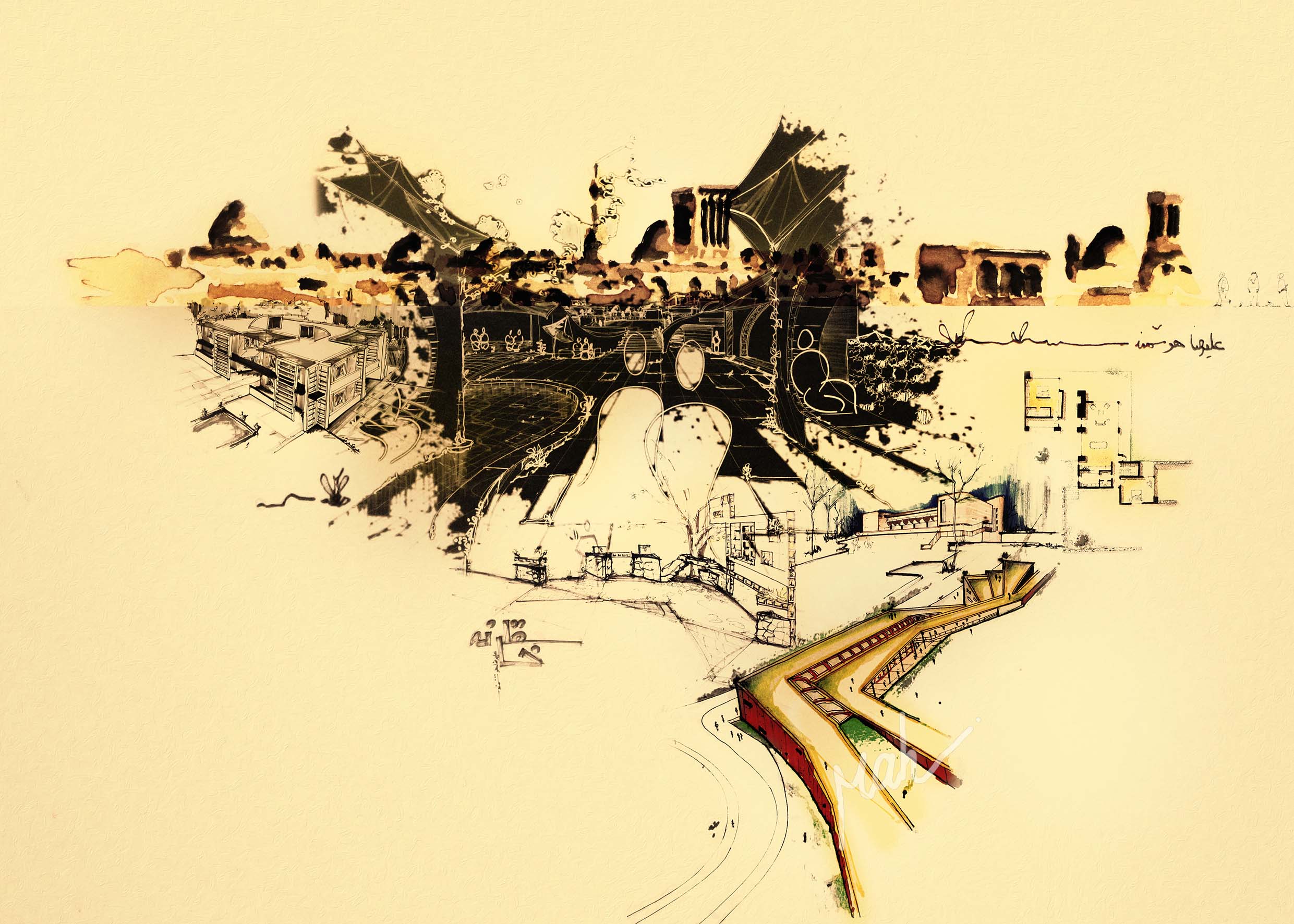 اسکیس حیات حیاط (طراحی عناصر الحاقی حیاط مرکزی پردیس هنرهای زیبا برای جشن ورودیها)
