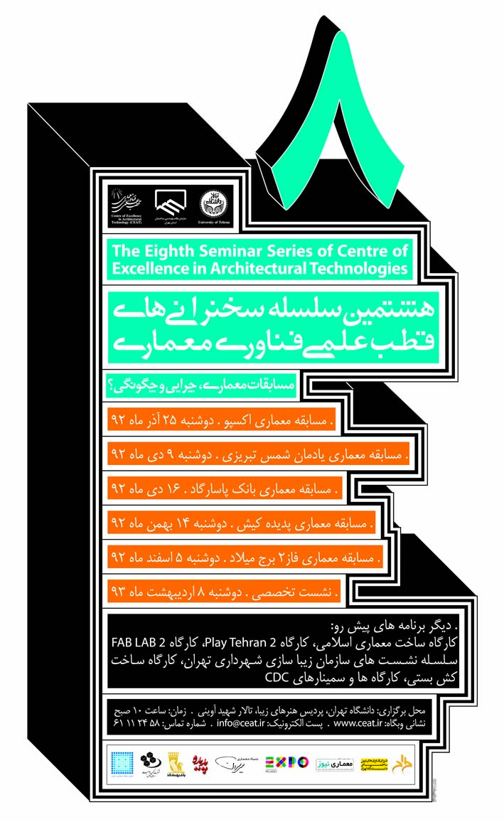 هشتمین سلسله سخنرانی های فناوری های نوین ساختمانی با موضوع "مسابقات معماری، چرایی و چگونگی" در دانشگاه تهران برگزار می گردد. این سلسله سخنرانی ها به بررسی مهمترین مسابقات معماری داخلی که در چند سال اخیر برگزار شده می پردازد. این جلسات با حضور برندگان مسابقه، برگزار کنندگان، هیئت داوران و اساتید دانشگاه های کشور در شش جلسه برگزار می گردد: