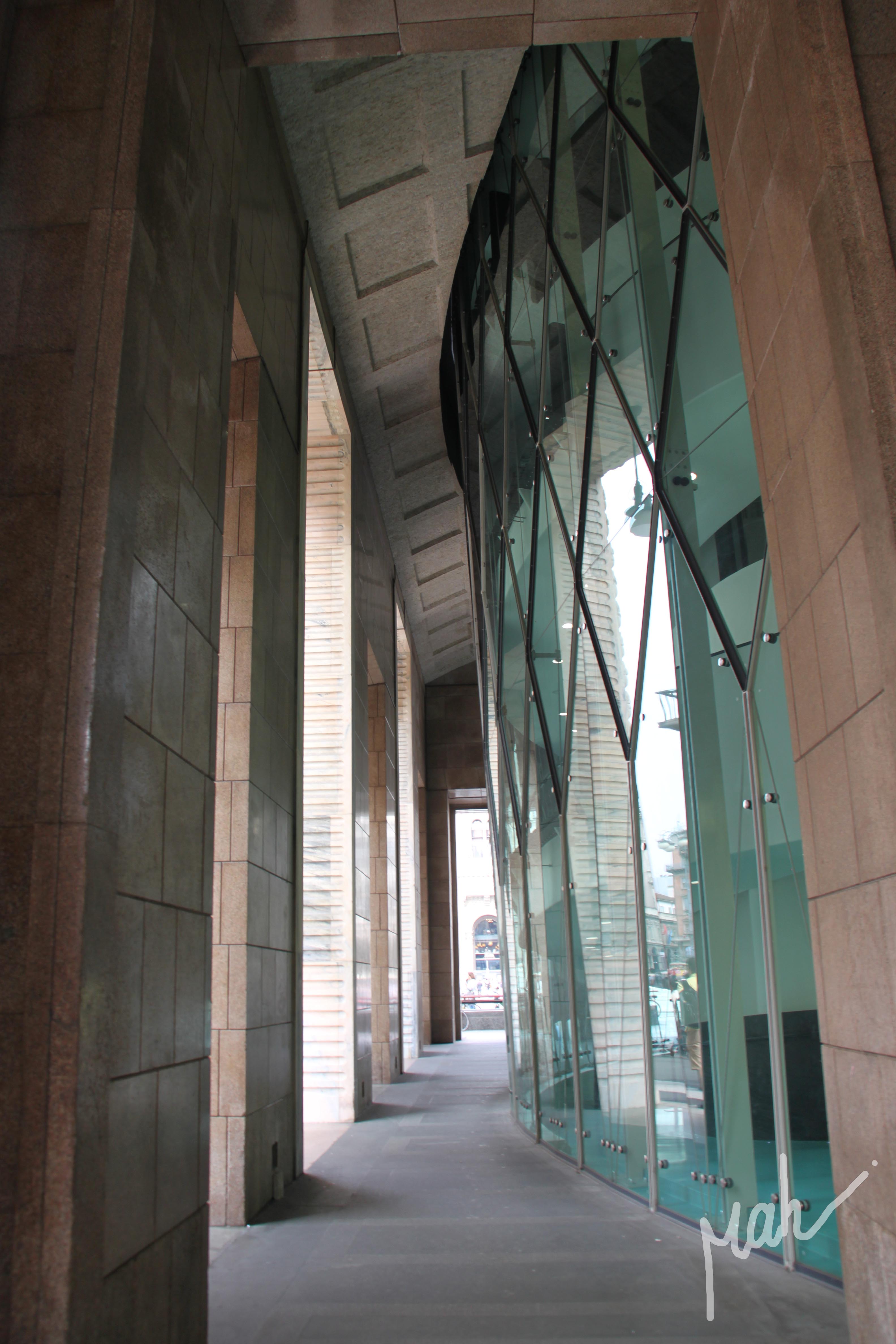 وقتی تصمیم میگیریم وارد موزه بشویم آنچه را که توجه مارا جلب میکند استفاده از تکنولوژی معماریست . ستونهای عظیمی همچون معماری کلاسیک شهر به پایین آمده که استوانه ای شیشه ای غیر همسان و پیچ خورده در بین ستونها خودش را مخفی کرده است.(همانطور که در عکس میبینید)