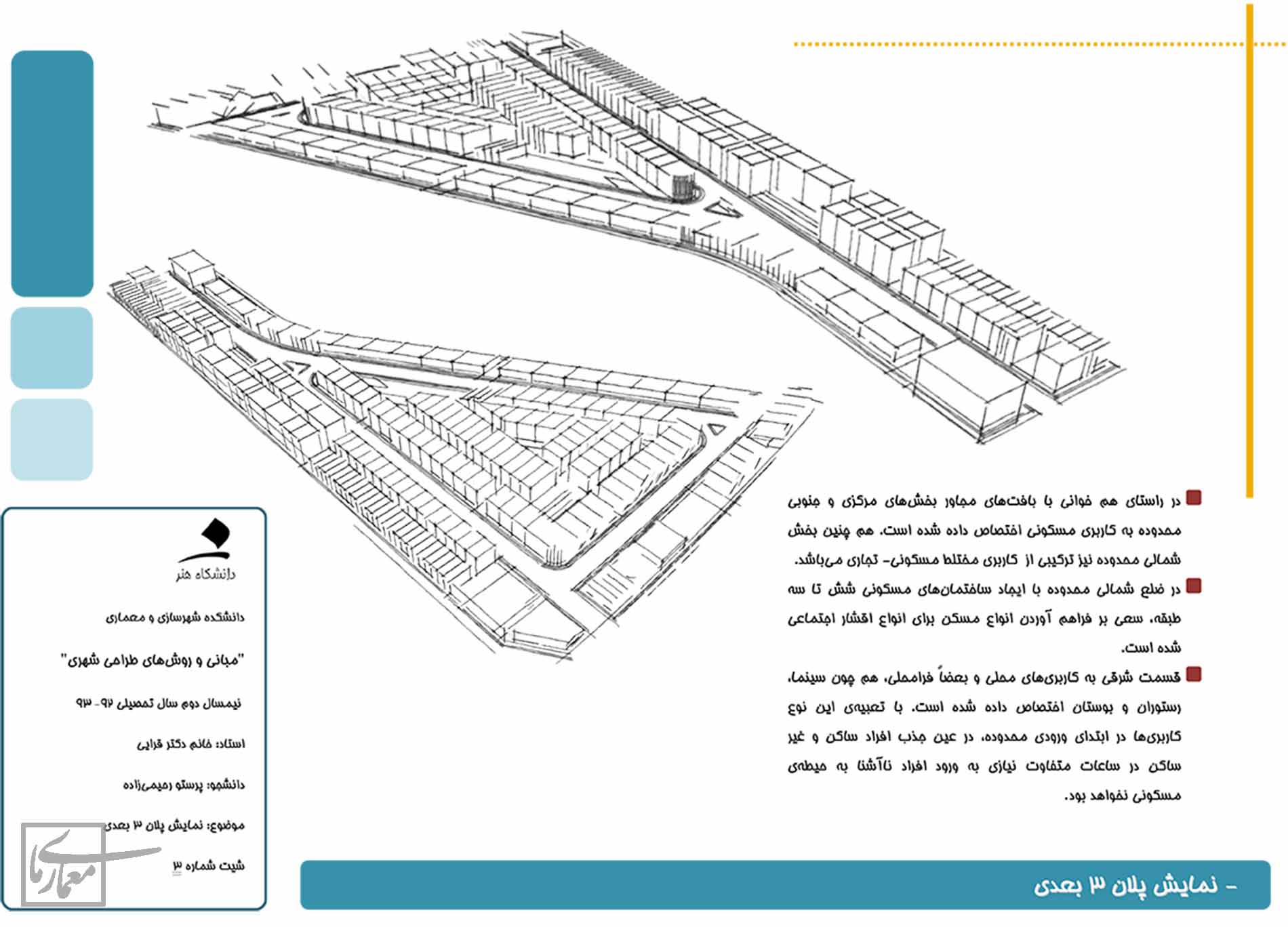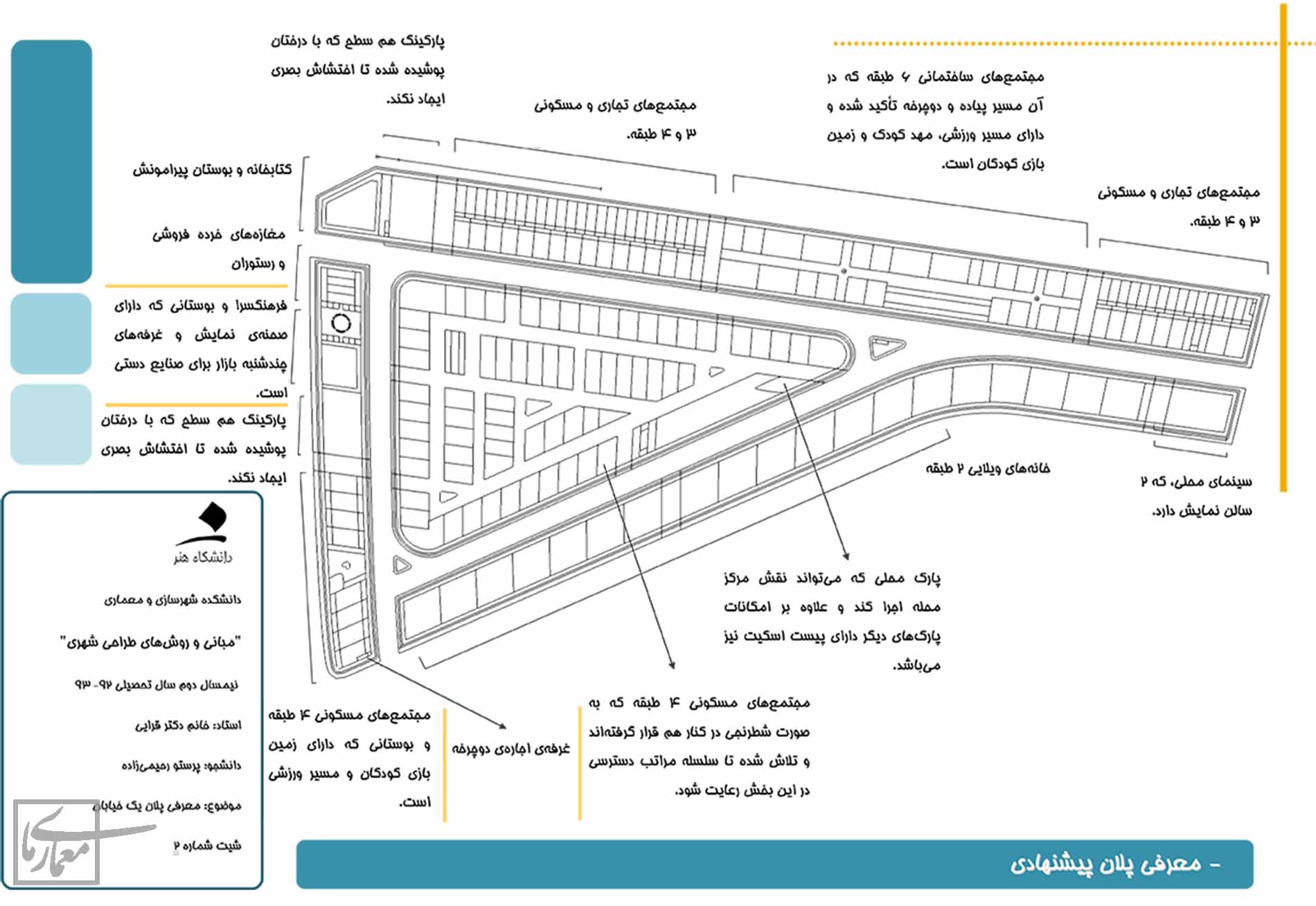 و چند دلیل برای این که چرا ساختمان ها به صورت پلکانی افزایش ارتفاع دارند: بلوک های جنوبی این محله مسکونی اند و من هم با قرار دادن خانه های ویلایی سعی کردم آرامش مسکونی محله های مجاور را به هم نزنم و ساختمان های 6طبقه مرز محله می باشند ولی با قرار دادن مسیر بیاده و تبدیل آن به "شهرک مانند"ِ کوچک تلاش شده تا از قرار دادن یک سری توده ی بی روح کنار هم اجتناب شود. و یک دلیل دیگر جهت باد مطلوب است از سمت غرب و جنوب غرب می وزد و نباید با ساختمان های بلند مانع آن می شدم در نتیجه خانه های ویلایی را در مسیر آن قرار دادم.